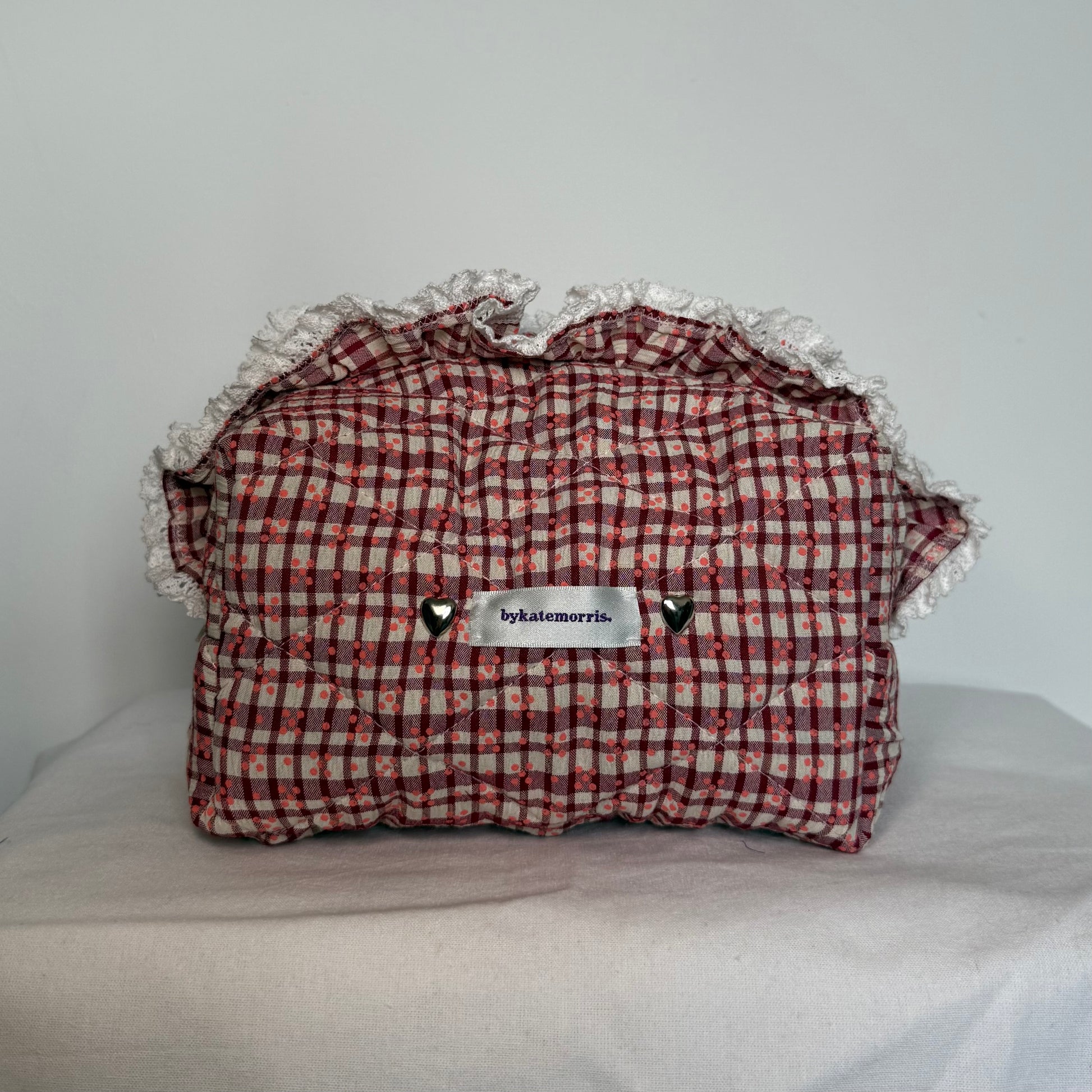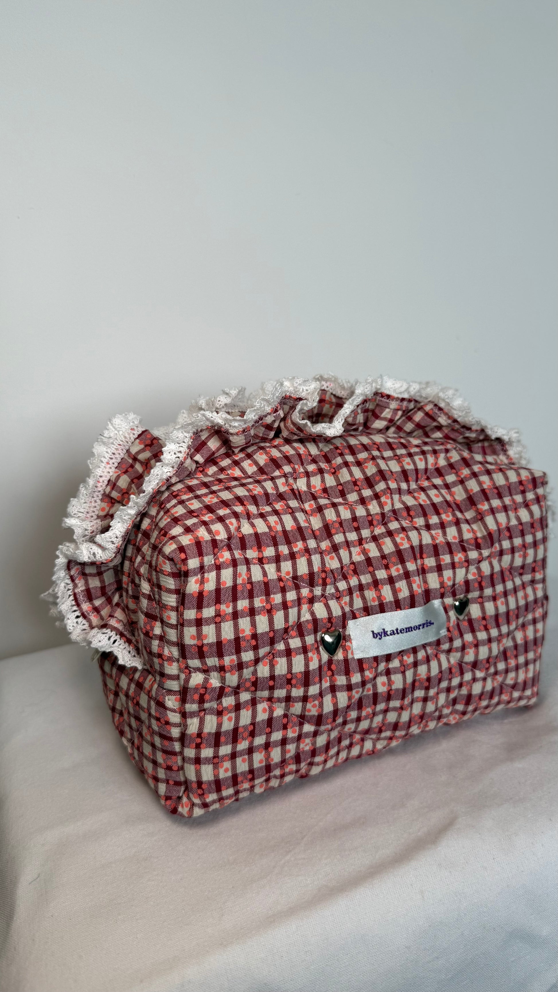 This sleek checkered make-up bag is not only stylish, but practical as well. The quilted lace frill adds a touch of elegance, while the spacious design allows for easy organizing of all your make-up essentials. Keep your items safe, secure and always at hand with this must-have accessory for any make-up lover.