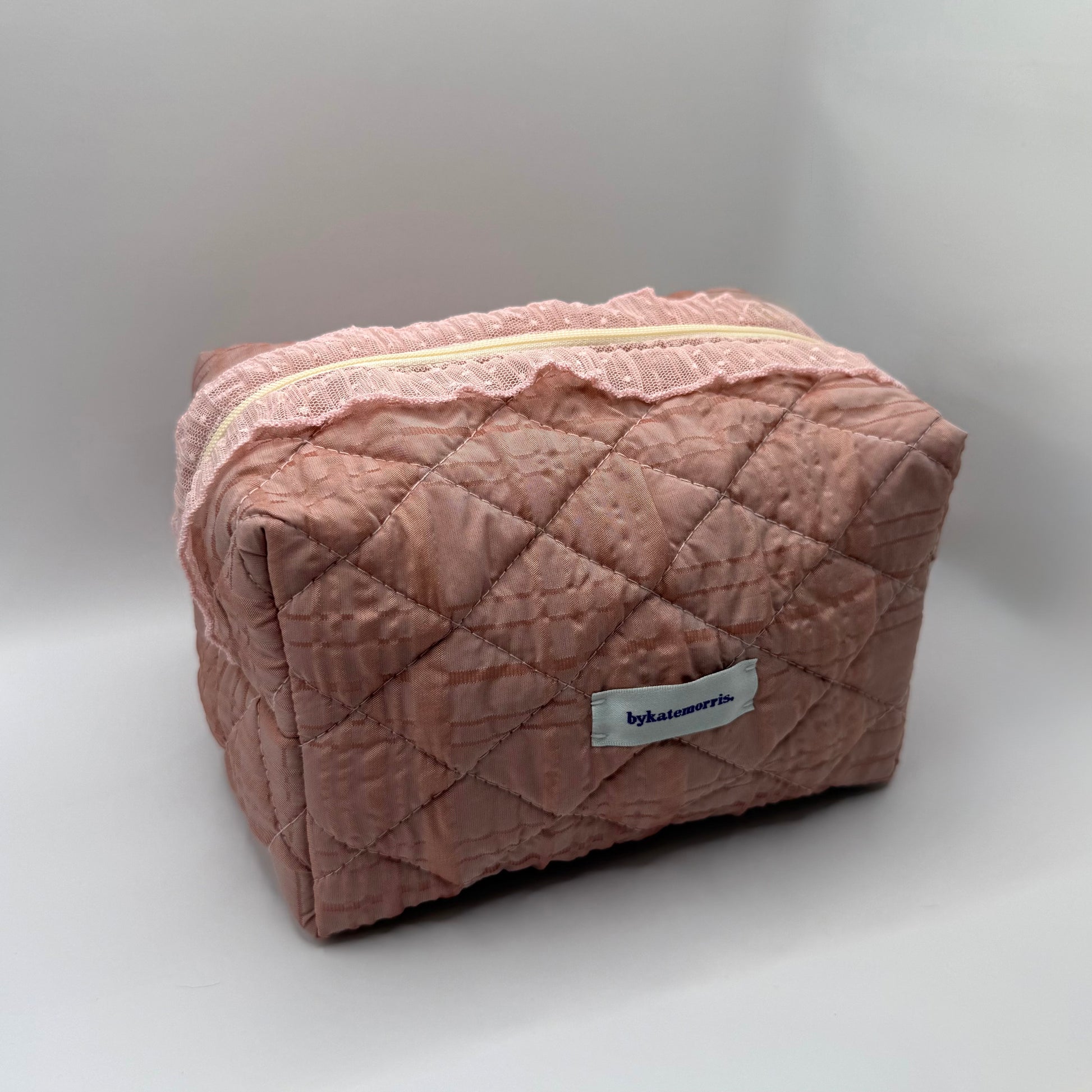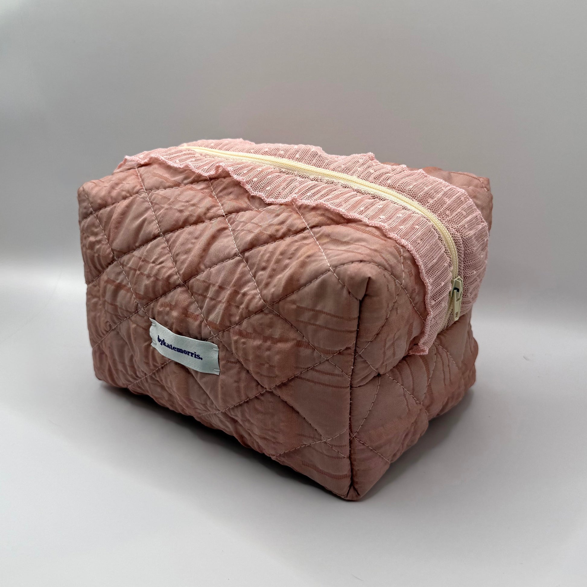 This Pink Make-up Bag is the perfect blend of style and functionality. Crafted with hot pink silk, it features a convenient zip closure and delicate baby pink frills. Keep all your cosmetics and toiletries organised while adding a touch of elegance to your daily routine.