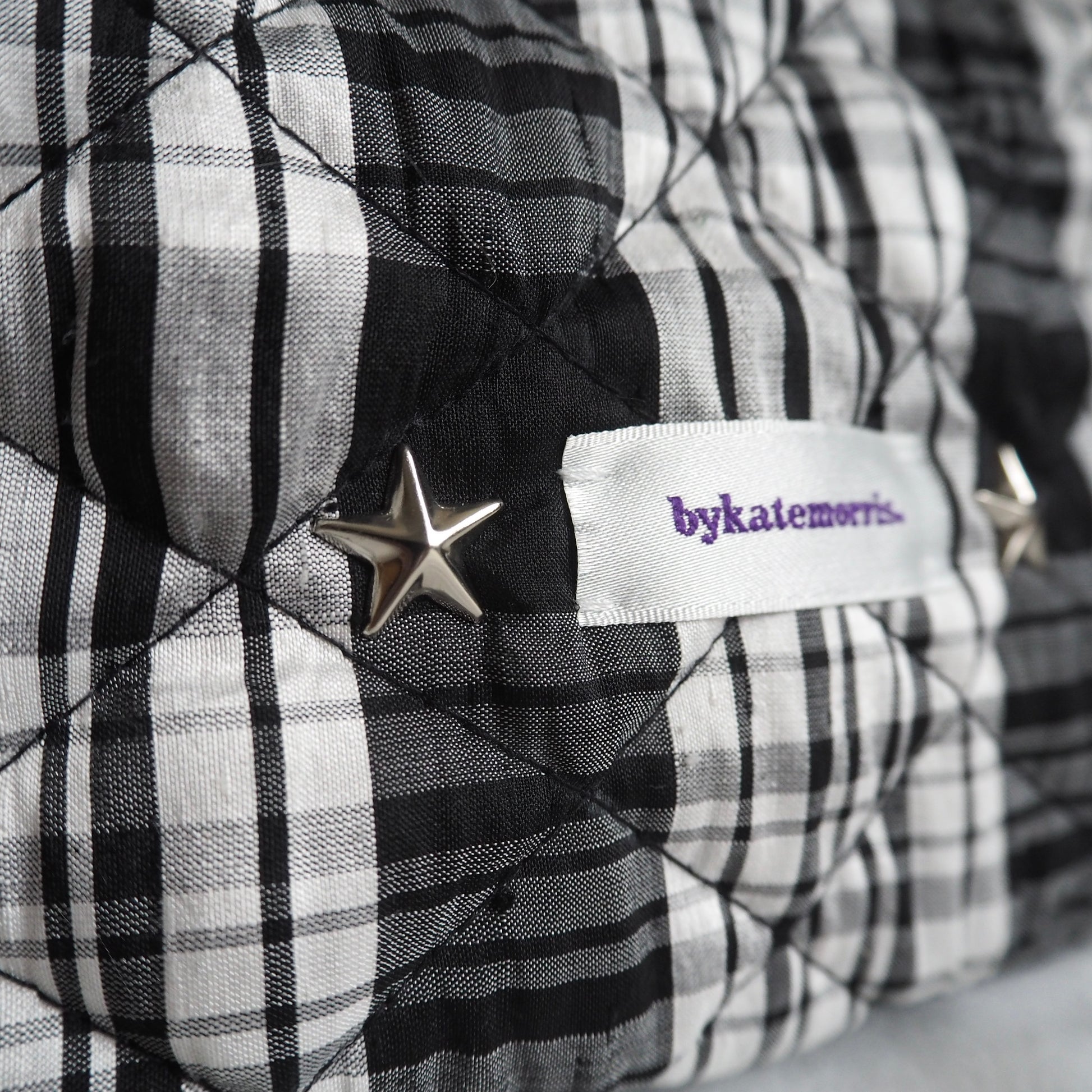Indulge in luxury with our Silk Make-up Bag! This gorgeous bag features a black and white silk design with elegant star details. The black velvet piping and zip add a touch of sophistication. Keep your make-organised and travel in style. Treat yourself to this must-have accessory today!